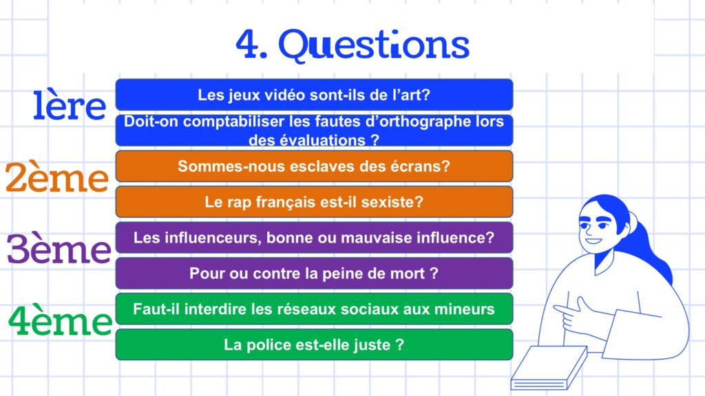 Enfin, les délégués ont proposé une série de questions qui nourriront les débats, parmi lesquelles : « Pour ou contre les devoirs à la maison ? », « L’homme est-il vraiment libre ? », « Avons-nous besoin du téléphone ? » ou encore « Nos données sont-elles en sécurité entre les mains des entreprises privées ? ».