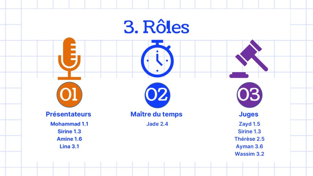 Sur le plan de l’organisation, plusieurs élèves se sont portés volontaires : quatre délégués pour le rôle de présentateur, un élève pour la gestion du temps et cinq élèves pour la fonction de juge. Une réunion spécifique sera prochainement organisée afin de les former à ces responsabilités.