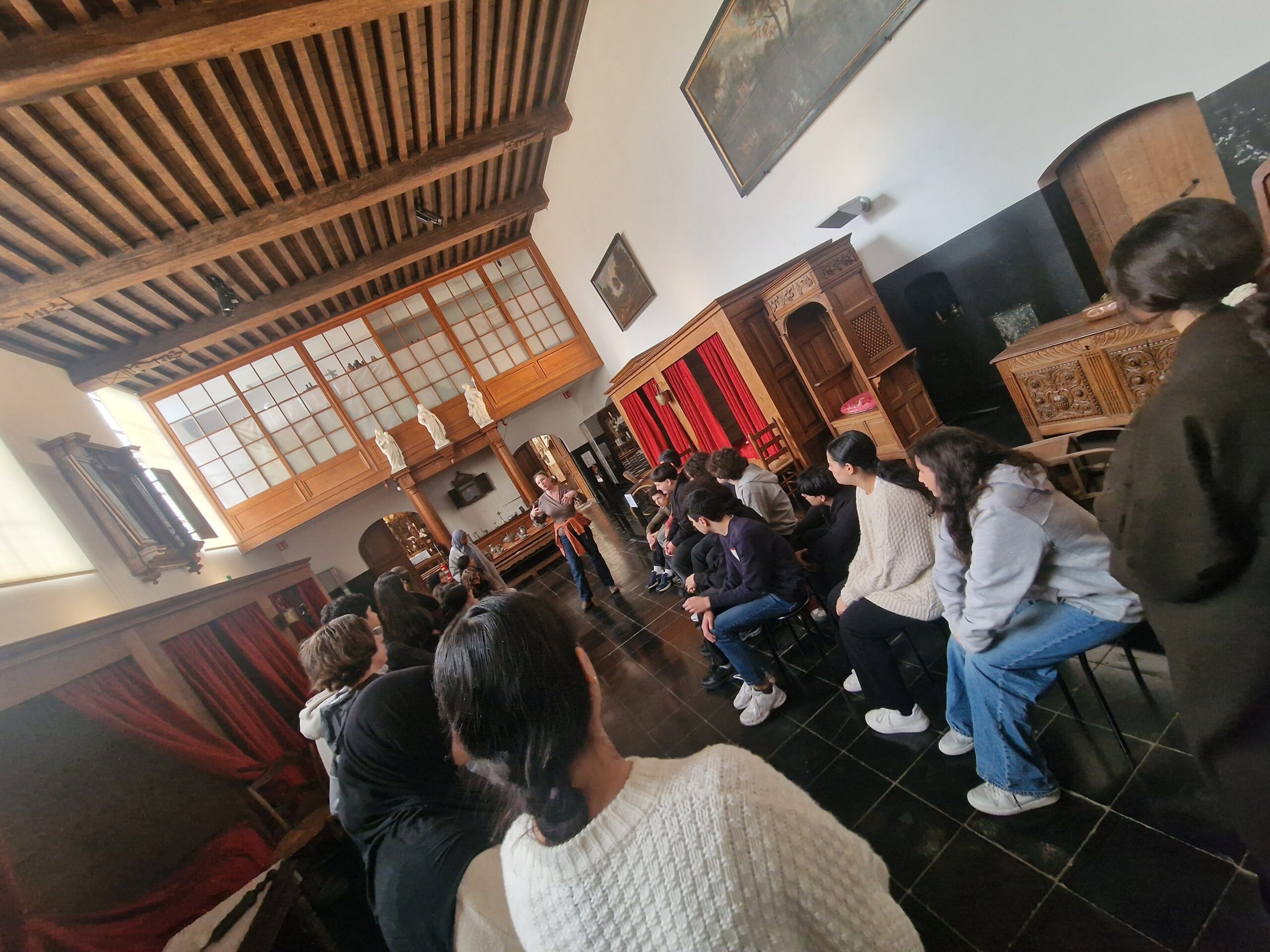 La journée s’est poursuivie au Moyen Âge, à l’Hôpital Notre-Dame à la Rose de Lessines, fondé au XIIIe siècle et resté en activité jusqu’en 1980. Ce lieu exceptionnel a permis aux élèves de mesurer l’évolution des pratiques médicales au fil des siècles, tout en découvrant l’organisation d’un hôpital médiéval.