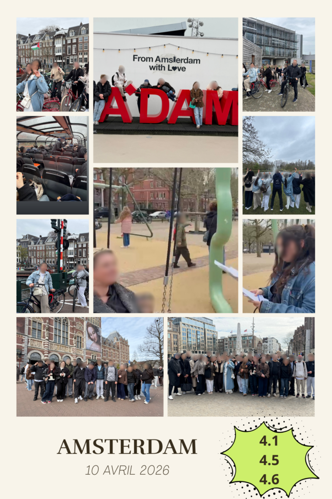 Le vendredi 10 avril 2026, les élèves de 4G ont eu l’opportunité de vivre une journée riche en découvertes à Amsterdam, au cœur d’un environnement néerlandophone authentique. Cette sortie, organisée par les professeures de néerlandais Mme Kurtoglu et Mme Irbik, s’inscrivait pleinement dans une démarche pédagogique mêlant apprentissages linguistiques, culturels et citoyens.